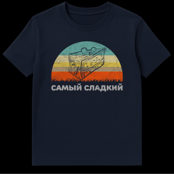 Indulge in a blend of deliciousness and retro charm with this unique t-shirt. The design features a captivating retro-style sunset, painted with warm horizontal stripes in inviting shades of teal, yellow, brown, and orange, evoking a nostalgic vibe. Front and center, a beautifully sketched slice of cake, complete with luscious cherries, adds a touch of playful sweetness. Below this delectable treat, the Russian text “Š”ŠŠœŠ«Š™ Š”Š›ŠŠ”ŠšŠ˜Š™” (SAMYY SLADKIY) boldly proclaims “The Sweetest.” This design cleverly plays on words, celebrating both literal sweet treats and the endearing sentiment of calling someone or something “the sweetest.” It’s a perfect conversation starter, appealing to anyone who appreciates vintage aesthetics, a good slice of cake, or has a connection to Russian culture and language. This tee is a heartfelt and humorous way to express your sweet side!