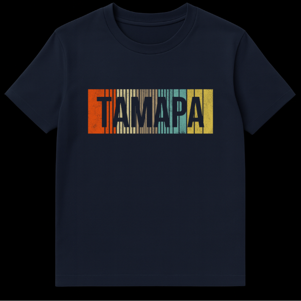 Step back in time with this distinctive t-shirt, showcasing a captivating vintage-inspired design. The central element is the word “TAMPA,” rendered in a robust, blocky font that evokes a timeless feel, further enhanced by a distressed effect for an authentic worn-in look. This text is artfully superimposed on a dynamic background of vertical stripes, meticulously chosen in a palette of retro colors: warm orange, soft cream, cool teal, and sunny yellow. The combination of these elements creates a strong vintage aesthetic, making the shirt perfect for those who appreciate classic styles and a touch of nostalgia. The theme is proudly location-based, celebrating the city of Tampa with a stylish, retro flair. There is no specific slogan to translate or cultural joke embedded in this design; its appeal lies purely in its visual homage to a bygone era and a specific geographic location. This design is ideal for anyone who loves Tampa, vintage fashion, or simply a unique, eye-catching graphic.