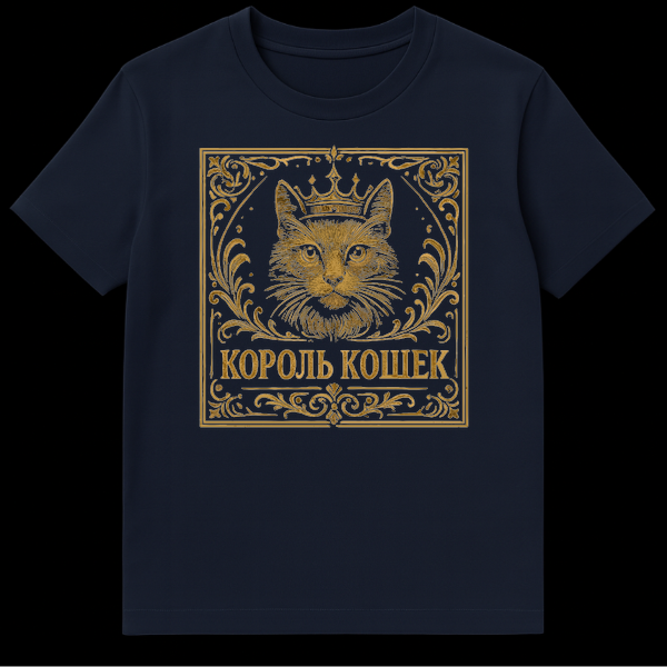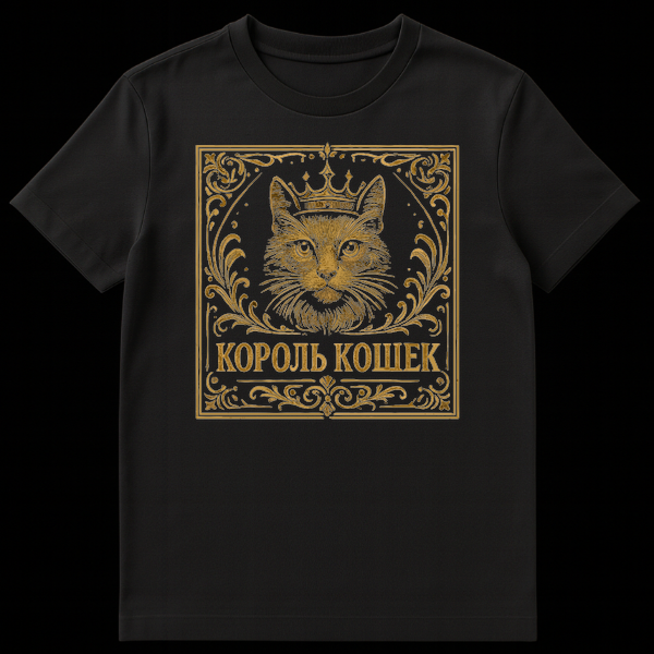 This exquisite black t-shirt features a vintage-style illustration of a regal cat wearing a golden crown, framed by ornate baroque flourishes. Below the majestic feline, the text “ŠšŠžŠ ŠžŠ›Š¬ ŠšŠžŠØŠ•Šš” translates to “King of Cats,” celebrating feline royalty. It’s a purr-fect blend of classic art and feline adoration.