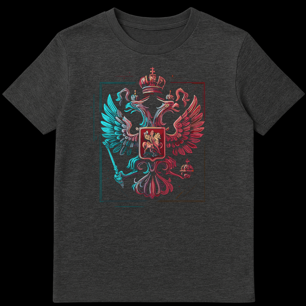 Embrace a bold statement of national pride with this unique t-shirt featuring a stylized Russian double-headed eagle emblem. The design reimagines traditional heraldry with a cutting-edge digital art aesthetic, giving the iconic eagle a modern, almost neon-like glow. The striking color contrast is a key element, with the left side of the eagle rendered in vibrant cyan/teal and the right side in a dynamic red/pink, creating an eye-catching visual that pops. Intricate layered lines and a subtle sketch-like border add depth and a contemporary edge to the classic symbol. This design is perfect for those who appreciate cultural symbolism and modern artistic expression, offering a fresh take on a powerful national emblem. There is no text on this design, allowing the powerful visual to speak for itself.