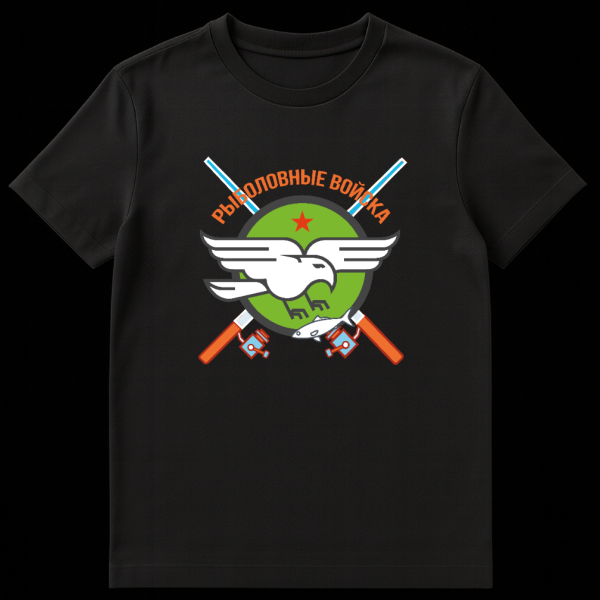 The arched orange text above, “РЫБОЛОВНЫЕ ВОЙСКА” (pronounced Rybolovnye Voyska), translates directly to “Fishing Troops.” This phrase is a clever and humorous twist on military terminology, playfully elevating the passion for fishing to the status of a strategic operation or a dedicated service branch. It’s an inside joke for anglers, celebrating their dedication, skill, and sometimes the ‘battle’ involved in landing a big catch. This t-shirt is an engaging conversation starter, blending a strong visual aesthetic with a witty cultural reference, making it ideal for fishing enthusiasts, fans of unique graphic apparel, or anyone who appreciates a good laugh.