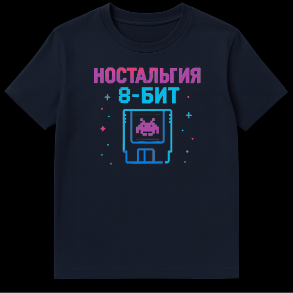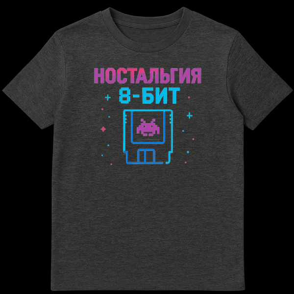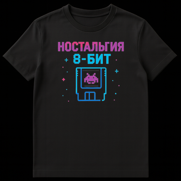 The theme, “8-bit nostalgia,” is powerfully conveyed through the Cyrillic text “НОСТАЛЬГИЯ 8-БИТ,” which translates directly to “NOSTALGIA 8-BIT.” This slogan is presented in a dynamic gradient of pink/purple and blue, adding an extra layer of retro cool. The cultural reference is a playful nod to the golden age of video games and home computers, appealing to anyone who grew up with or appreciates the foundational era of digital entertainment. It’s a celebration of simpler times, when graphics were blocky, but the fun was limitless. The ‘joke’ or cleverness lies in the universal recognition of these vintage elements combined with the Russian language, creating a unique blend of global retro appeal and specific cultural flavor. It’s a stylish statement piece that connects generations through shared digital history.