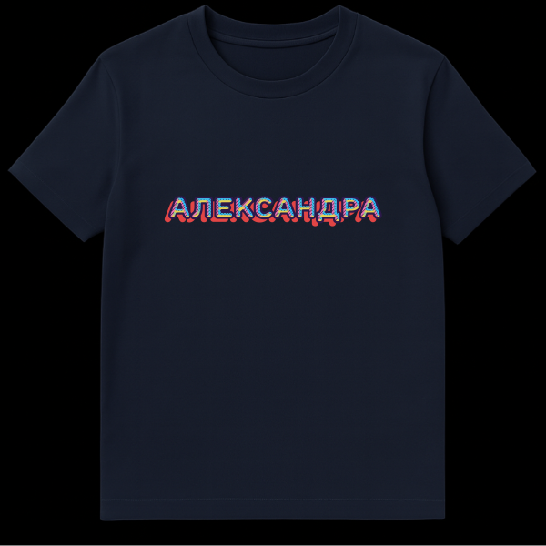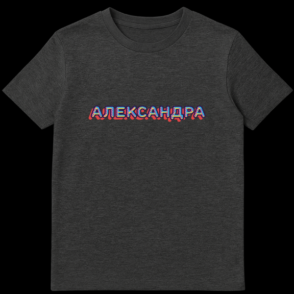 Step out in style with our eye-catching t-shirt, showcasing the beautiful Russian name “АЛЕКСАНДРА” (Alexandra) in an unforgettable design. This piece captures a vibrant, retro aesthetic with its dynamic 3D-style text, making it a true conversation starter. Each letter is meticulously crafted with a sharp dark outline, encasing a lively fill adorned with an eclectic mix of stripes and polka dots in cheerful shades of blue, pink, and yellow. A dramatic red drop shadow adds depth and a cool, nostalgic flair, all set against a versatile plain gray background. This t-shirt celebrates Russian culture and language, offering a unique way to express individuality or a connection to the name Alexandra. It’s perfect for those who appreciate bold graphics, retro fashion, and a touch of international charm. There’s no hidden joke, just a stylish presentation of a classic name.