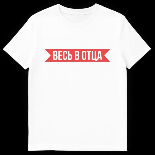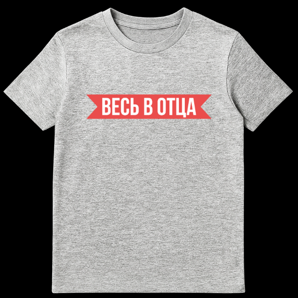 Embrace familial pride with this striking and minimalist t-shirt. The design showcases a vibrant red banner with distinctive pointed ends, horizontally centered against a neutral gray background. Bold, white, sans-serif text reads “ВЕСЬ В ОТЦА” (VES’ V OTTSA), a popular Russian phrase that translates to “All in the Father” or “Just like Dad.” This expression is often used affectionately or humorously to highlight how much a child resembles or embodies the characteristics of their father, celebrating a deep connection and inherited traits. The clean, direct style emphasizes the powerful message, making it a perfect statement piece for anyone proud of their heritage or the strong bond with their dad. It’s a subtle nod to Russian culture, celebrating family ties with a modern aesthetic.