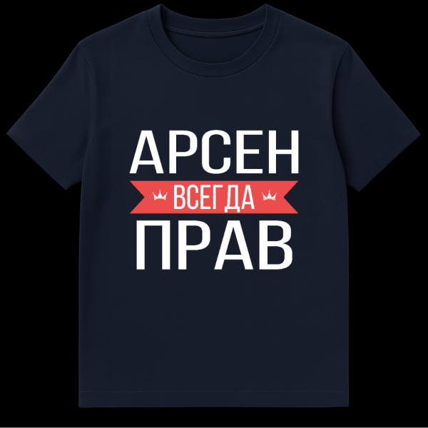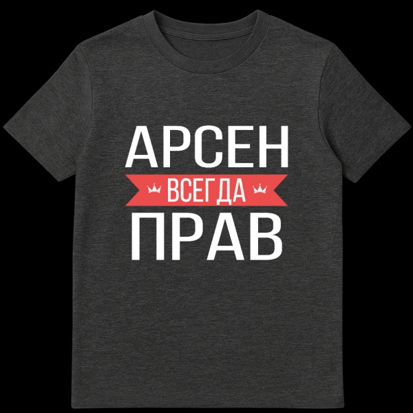 Embrace a fun, declarative statement with this graphically striking t-shirt. The design features bold, white Cyrillic text prominently displayed on a sleek grey background, ensuring high contrast and visibility. At its heart, the word “ŠŠ”ŠŠŠŠ” (ALWAYS) is elegantly set within a vibrant red banner, subtly accented by small white crown icons on either side, adding a touch of regal humor. The complete phrase, “ŠŠ Š”ŠŠ ŠŠ”ŠŠŠŠ ŠŠ ŠŠ,” translates directly to “ARSEN IS ALWAYS RIGHT.” This design delivers a clean, modern aesthetic with a witty, humorous theme, perfect for anyone named Arsen or for those who appreciate a good-natured, self-assured joke. It’s a playful nod to a universally understood sentiment, presented with a unique Russian linguistic flair that makes it both engaging and a conversation starter.
