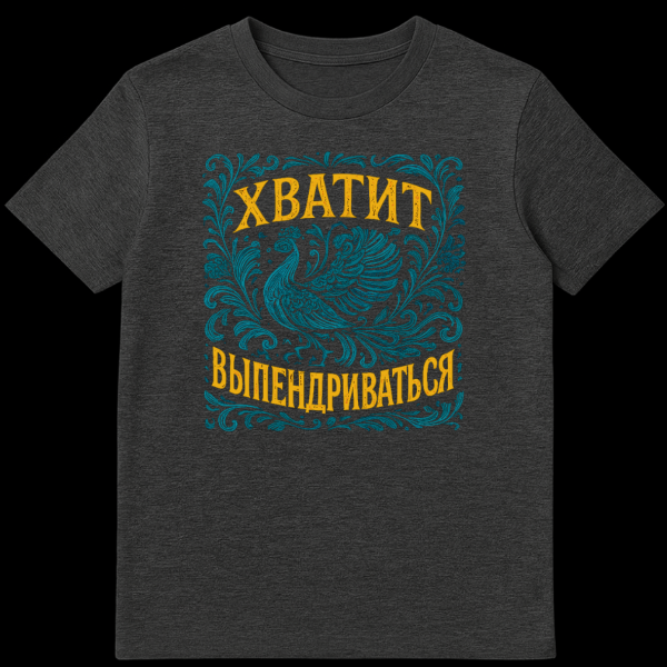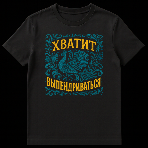 Adding a playful, slightly rebellious edge are the distressed, bold yellow Russian texts. The top text, “KHVATIT” (Š„ŠŠŠ¢ŠŠ¢), translates to “Enough” or “Stop,” while the bottom text, “VYPENDRIVAT’SYA” (ŠŠ«ŠŠŠŠŠ ŠŠŠŠ¢Š¬Š”ŠÆ), is a colloquial and somewhat rude term meaning “showing off” or “acting fancy.” Together, they deliver the punchy message: “Stop showing off!” This humorous and direct slogan adds a contemporary twist to the traditional aesthetic, making it a perfect conversation starter.