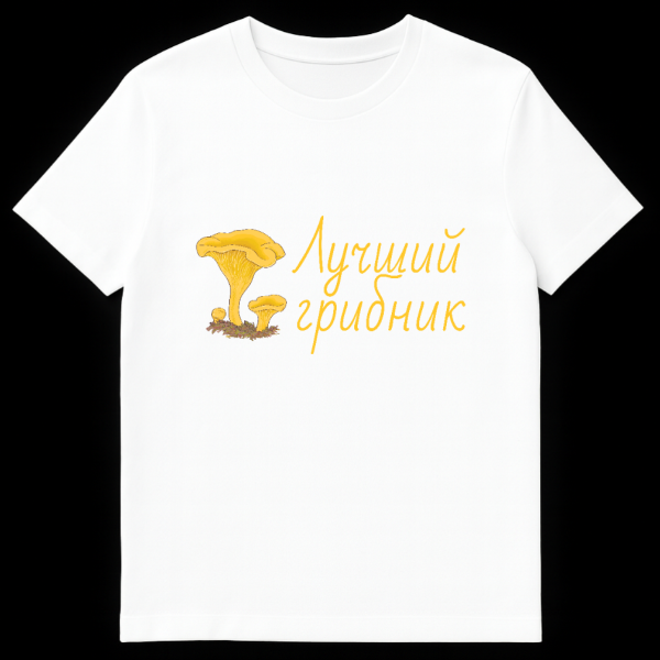 This unique Russian T-Shirt features a vibrant, realistic illustration of yellow chanterelle mushrooms on a solid gray background. Beside them, the yellow, handwritten-style text “Luchshiy gribnik” translates to “Best mushroom picker,” celebrating the art of foraging.