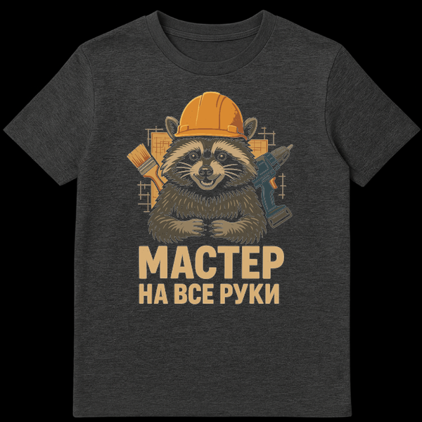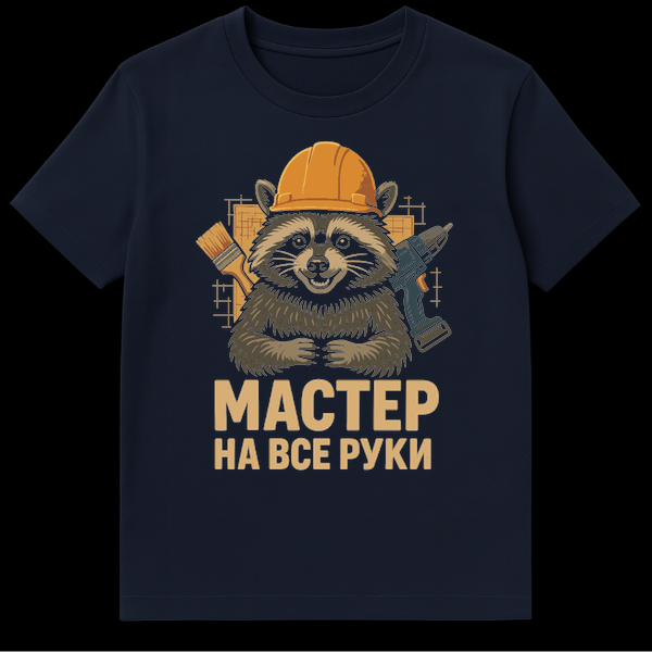This charming Russian T-Shirt features a cheerful, cartoon raccoon wearing an orange hard hat, ready for action with a paintbrush and drill. Architectural sketches form a dynamic background, perfectly capturing the handyman theme. The text “ŠŠŠ”Š¢ŠŠ ŠŠ ŠŠ”Š Š Š£ŠŠ” translates to “Master of All Trades,” celebrating skilled craftsmanship.