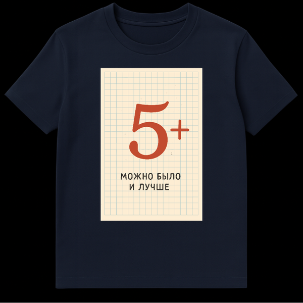 This unique Russian T-Shirt features a retro-academic design with a large red ‘5+’ grade on a notebook paper background. Below it, the phrase ‘ŠŠŠŠŠ ŠŠ«ŠŠ Š ŠŠ£Š§ŠØŠ’ translates to ‘It could have been better,’ capturing a humorous, self-deprecating pursuit of perfection.