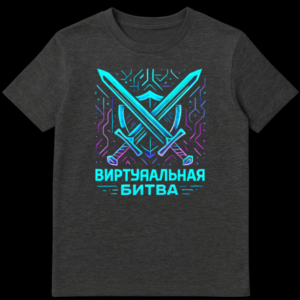 Below this striking graphic, the t-shirt features Cyrillic script: ‘ŠŠŠ Š¢Š£ŠŠŠ¬ŠŠŠÆ ŠŠŠ¢ŠŠ’, rendered in a matching glowing cyan font. This phrase translates directly to ‘VIRTUAL BATTLE’ in English, reinforcing the theme of digital conflict and gaming. The inclusion of Cyrillic script adds an authentic touch, appealing to fans of Russian culture, language, and the broader global gaming community. This design isn’t just a statement; it’s an invitation to explore the intersection where classic combat meets the virtual arena, making it an ideal choice for gamers, tech enthusiasts, and anyone drawn to the cyberpunk aesthetic. There isn’t a specific ‘joke’ in the design, but the clever juxtaposition of medieval weaponry with a high-tech, virtual context creates an intriguing and thought-provoking visual narrative.