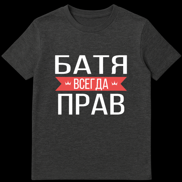 This grey Russian T-Shirt features bold white Cyrillic text, ‘BATYA VSEGDA PRAV,’ meaning ‘Dad is Always Right.’ A central red banner with notched ends highlights ‘VSEGDA’ and includes two small crown icons, celebrating fatherhood with humor.