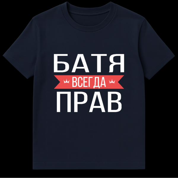 Celebrate the timeless wisdom (and humor) of dads everywhere with this unique Russian T-Shirt. The design proudly displays the phrase ‘БАТЯ ВСЕГДА ПРАВ’ in bold white Cyrillic letters on a stylish grey background. ‘БАТЯ’ (Batya) is a warm, affectionate, yet strong term for ‘Dad’ or ‘Father’ in Russian, while ‘ВСЕГДА ПРАВ’ (Vsegda Prav) translates to ‘Always Right.’ This classic proclamation is humorously embraced by fathers globally. A striking red banner with elegant notched ends draws attention to the word ‘ВСЕГДА’ (Always), flanked by two small crown icons, subtly declaring dad’s sovereign (and sometimes self-proclaimed) authority. This shirt is a perfect blend of cultural charm and universal fatherhood humor, making it an ideal gift for Father’s Day, birthdays, or just to show appreciation for the patriarch who always knows best – or at least thinks he does!