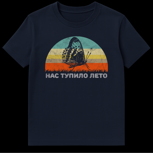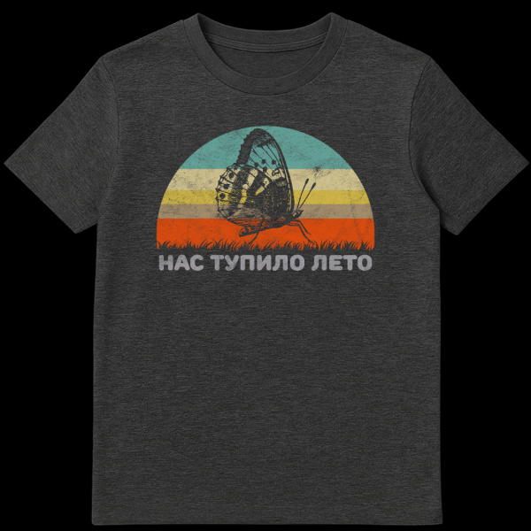 Embrace summer’s laid-back vibe with this vintage-inspired t-shirt featuring a large, distressed grey butterfly silhouette against a vibrant retro-striped sunset. Orange grass grounds the scene, while the grey Cyrillic text ‘NAS TUPILO LETO’ translates to ‘Summer has made us dumb,’ capturing the humorous, brain-fogging effect of a long, hot season.