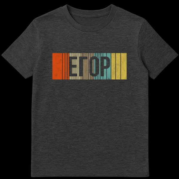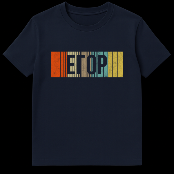 Step out in distinctive style with our Russian T-Shirt, showcasing the word “EFOP” (ЕФОП) in a captivating retro-distressed font. The letters are intricately formed by vertical stripes of varying widths and colors, including vibrant orange, soft beige, rich brown, cool teal, and sunny yellow, giving it a unique barcode-like appearance. This vintage-inspired aesthetic evokes a sense of nostalgia, perfect for those who appreciate a playful, stylized look. While “EFOP” (ЕФОП) isn’t a direct Russian word or common acronym, its Cyrillic-esque presentation and the distressed, barcode style often playfully allude to Soviet-era graphics or a general ‘Russian’ aesthetic, creating an amusing and intriguing visual that sparks curiosity. It’s a fun, abstract nod to a bygone era, making it an excellent conversation starter and a stylish addition to any wardrobe.