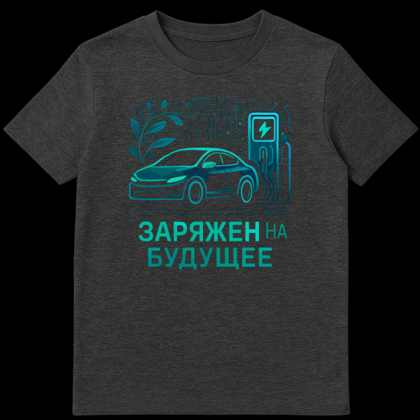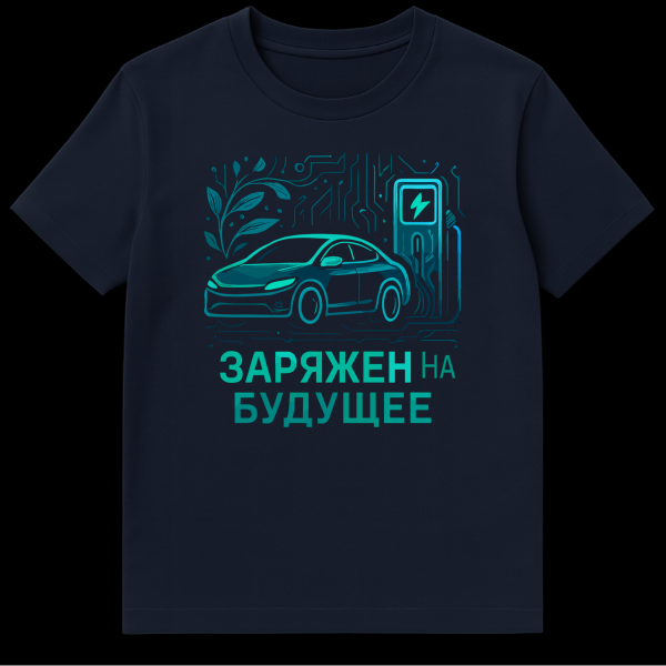 This captivating Russian T-Shirt features an electric car charging, surrounded by intricate circuit board patterns and lush organic plant elements. It blends tech and nature in a futuristic teal/cyan palette. The slogan ‘ŠŠŠ ŠÆŠŠŠ ŠŠ ŠŠ£ŠŠ£Š©ŠŠ’ translates to ‘Charged for the Future’, embodying innovation and sustainability.