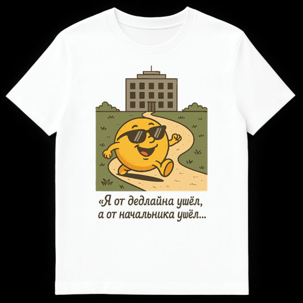 The core theme is the universal desire to escape work and daily responsibilities. The humorous Russian text reads: “ŠÆ от ГеГлайна ŃƒŃˆŃ‘Š», а от Š½Š°Ń‡Š°Š»ŃŒŠ½ŠøŠŗŠ° ŃƒŃˆŃ‘Š»…” which translates to “I left the deadline, and I left the boss…”. This playful phrase perfectly encapsulates the relief and satisfaction of leaving behind the pressures of work, making it a relatable and amusing statement piece for anyone who dreams of clocking out for good.
