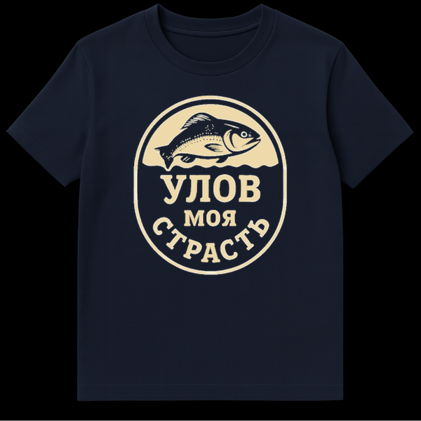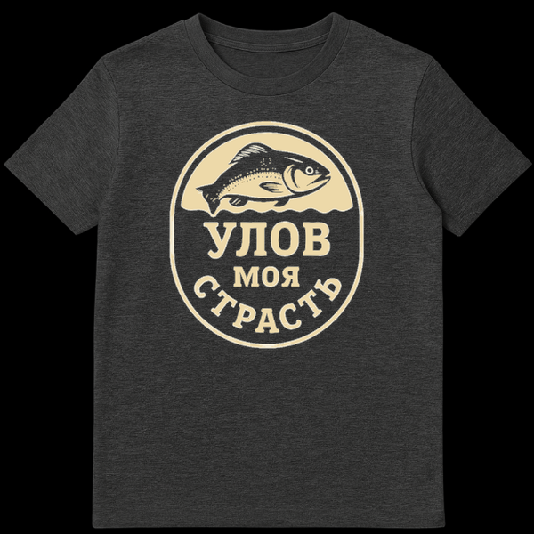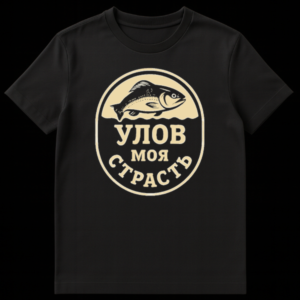 This t-shirt features a classic black and beige circular emblem, showcasing a detailed fish silhouette above a wavy line, symbolizing water. The lower half proudly displays the Russian slogan “Š£Š›ŠžŠ’ ŠœŠžŠÆ ДТРАДТЬ,” which translates to “CATCH MY PASSION.” It’s a perfect blend of illustrative art and a deep love for fishing.