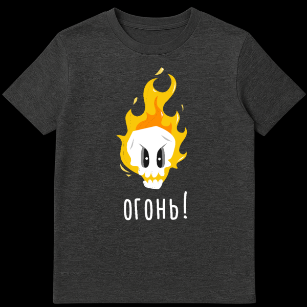 Unleash your inner fire with our unique Russian T-Shirt, a bold statement piece that combines edgy graphics with a powerful cultural exclamation. The centerpiece is a stylized, flaming white skull, rendered in a captivating cartoonish style with large, expressive black eyes that give it a playful yet intense appeal. Below this fiery icon, the Russian word “ОГОНЬ!” (pronounced “OGON!”) is prominently displayed in blocky, slightly distressed white letters, adding to the shirt’s gritty charm. “ОГОНЬ!” directly translates to “FIRE!” but in Russian slang, it also conveys excitement, approval, or something being “awesome” or “lit.” The solid grey background provides a neutral canvas, allowing the vibrant white skull and text to truly pop. This T-shirt is perfect for those who appreciate unique graphic apparel, have a connection to Russian culture, or simply love a design that makes a strong, fiery statement. It’s a fantastic conversation starter, blending cool aesthetics with a touch of linguistic flair.