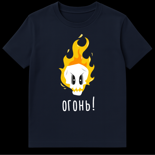 Russian T-Shirt: Flaming Skull, “OGON!” (FIRE!) Cartoon Style