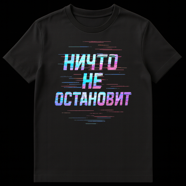Embrace retro-futurism with this striking t-shirt featuring Russian text “ŠŠŠ§Š¢Š ŠŠ ŠŠ”Š¢ŠŠŠŠŠŠ¢” (Nothing Will Stop) in a vibrant, glitch-effect style. The blue-to-pink gradient and digital static evoke a powerful, unstoppable message. It’s a bold statement piece for any wardrobe.