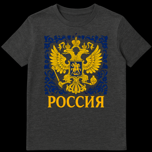 Embrace a symbol of rich history and national pride with this exquisitely designed t-shirt featuring the iconic Russian double-headed eagle emblem. Rendered in a majestic gold, the eagle stands out with its intricate heraldic details, representing centuries of Russian heritage and sovereignty. Flanking this powerful emblem are delicate blue floral and foliage motifs, adding an elegant touch that beautifully complements the golden centerpiece. Below the eagle, the word ‘Š ŠŠ”Š”ŠŠÆ’ (pronounced ‘Rossiya’), which translates to ‘Russia’, is boldly written in gold Cyrillic letters, making a clear and proud statement of identity. This design is a perfect blend of traditional heraldic artistry and patriotic sentiment, appealing to anyone who appreciates Russian culture, history, and national symbols. Wear your heritage with pride and sophistication.