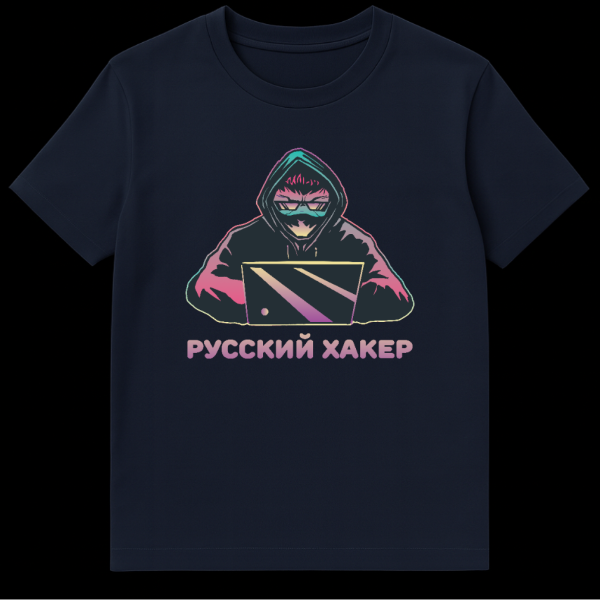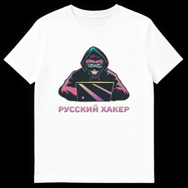Beneath the captivating illustration, the bold text “РУССКИЙ ХАКЕР” is emblazoned in a matching gradient font. This phrase translates directly to “RUSSIAN HACKER” and plays on the widely recognized, often sensationalized, stereotype of Russian involvement in cyber activities. The design embraces this pop culture reference with a tongue-in-cheek nod, making it both a stylish statement and a conversation starter. It’s perfect for tech enthusiasts, gamers, programmers, or anyone with a sense of humor about internet culture and a love for cutting-edge aesthetics. Wear it to express your passion for technology, mystery, and the vibrant world of digital art.