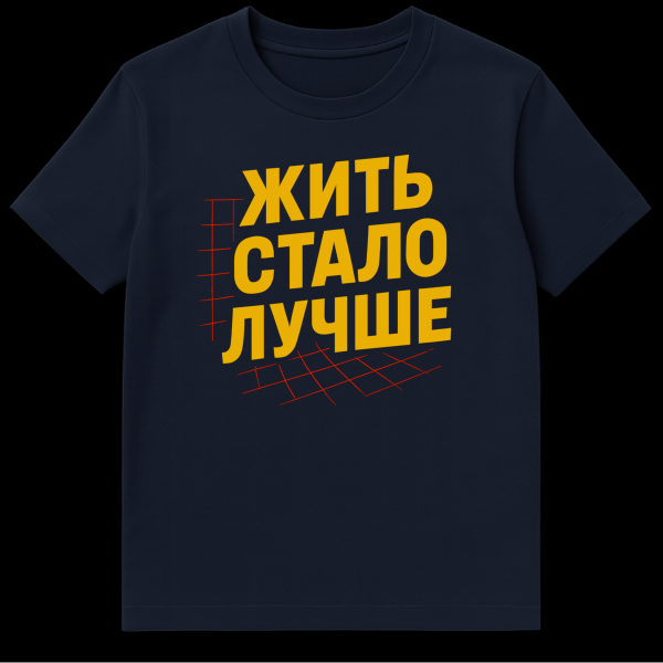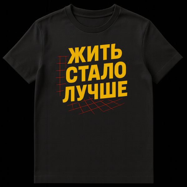 Embrace a unique blend of graphic design and cultural commentary with this distinctive t-shirt. The centerpiece is the large, bold, yellow Russian text “ЖИТЬ СТАЛО ЛУЧШЕ,” which translates to “Life Has Become Better.” Rendered in a slightly tilted, 3D perspective against a cool grey background, the text immediately grabs attention. Red grid lines are strategically drawn around the lettering, further enhancing the three-dimensional effect and adding a dynamic, retro-futuristic touch. The overall style is graphically strong and somewhat vintage, evoking the aesthetics of mid-20th century propaganda posters. This design carries a layer of ironic or propaganda-like optimism, referencing a famous Soviet-era slogan often used to project an image of prosperity and improvement, even when reality might have been different. It’s a statement piece for those who appreciate history, political satire, or simply bold, thought-provoking graphics. Wear it to spark conversations and showcase a unique sense of humor and style.