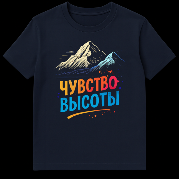 The style is a harmonious blend of hand-drawn artistry and modern typography, giving the design a unique, artistic edge. Colorful splatters add a dynamic, energetic touch, while a gracefully curved underline enhances the overall flow and movement of the artwork. This t-shirt is more than just apparel; it’s a statement for adventurers, nature lovers, and those who appreciate the cultural depth of the Russian language and its poetic expressions. While there isn’t a specific joke, the design humorously elevates the simple act of wearing a shirt into an experience of grand vistas and personal triumph, making it a conversation starter and a symbol of aspiration.