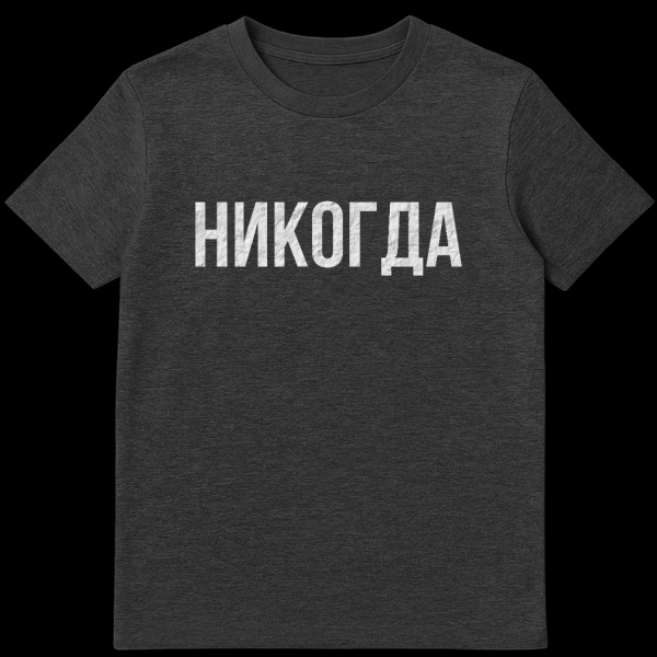 This minimalist Russian T-Shirt features the powerful word ‘НИКОГДА’ (NIKOGDA), meaning ‘NEVER,’ in large, distressed white capital letters. The bold text has a rugged, textured appearance, standing out starkly against the solid gray background for a strong, clear message.