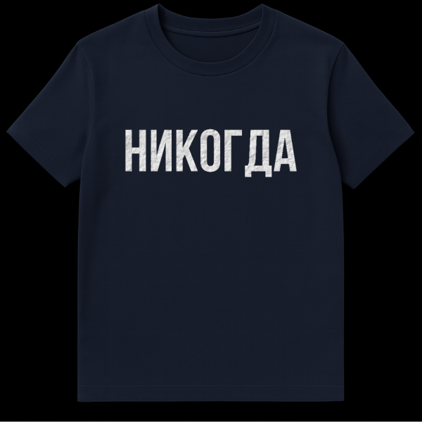 Embrace a statement of unwavering resolve with this striking Russian T-Shirt. The centerpiece is the Russian word ‘НИКОГДА’ (NIKOGDA), translated as ‘NEVER,’ presented in prominent, distressed white capital letters. This design embodies a minimalist yet powerful aesthetic, with the text’s slightly rugged and textured appearance adding depth and character against the solid gray background. The stark contrast ensures the message is clear and impactful, resonating with anyone who values strong convictions and a resolute spirit. This piece is more than just apparel; it’s a declaration, a tribute to the enduring power of language, and a nod to Russian culture, making it a unique addition to any wardrobe. It’s perfect for those who appreciate bold simplicity and a message that speaks volumes without saying a word.