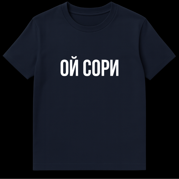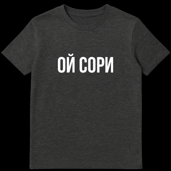 This t-shirt features bold, white Cyrillic text ‘OY SORI’ centrally placed on a plain grey background. The phrase translates to ‘Oh, sorry,’ offering a direct and subtly humorous or apologetic statement. Its minimalist style makes it a versatile and conversation-starting piece.