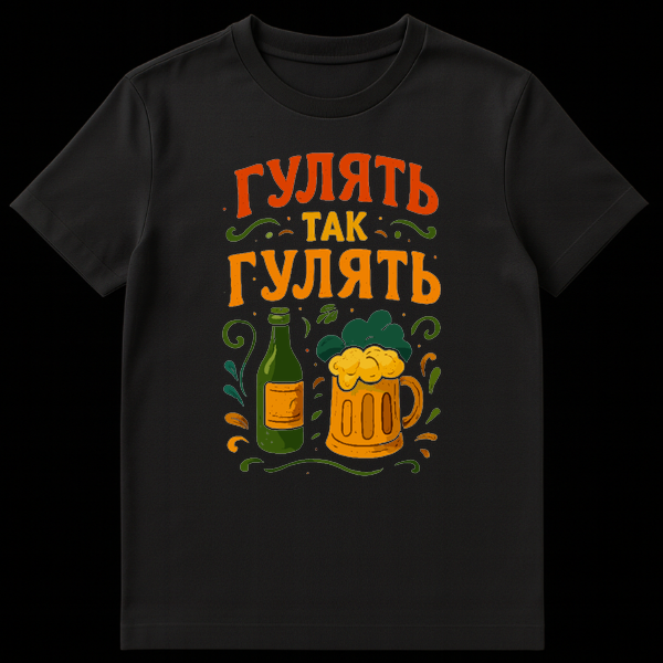 Rendered in a hand-drawn, somewhat distressed style, this design boasts a warm, autumnal color palette that feels both cozy and exciting. The central theme revolves around celebration, drinking, and good times, making it an ideal choice for parties, gatherings, or simply expressing your joyful outlook. The powerful Russian text, “ŠŠ£ŠŠÆŠ¢Š¬ Š¢ŠŠ ŠŠ£ŠŠÆŠ¢Š¬” (GULYAT’ TAK GULYAT’), translates to “If you’re going to party, then party!” or “Let’s party hard!” This popular phrase is a spirited call to action, encouraging full immersion in fun and enjoyment. It’s a playful nod to Russian culture’s hearty approach to festivities, inviting everyone to let loose and make the most of the moment. This t-shirt is more than just apparel; it’s a statement of zest for life.