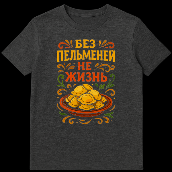 This t-shirt showcases a vibrant, folk-art illustration of a bowl of pelmeni with decorative flourishes. The design playfully declares “БЕЗ ПЕЛЬМЕНЕЙ НЕ ЖИЗНЬ” which translates to “Without pelmeni, it’s not life,” expressing a deep affection for the dumplings.