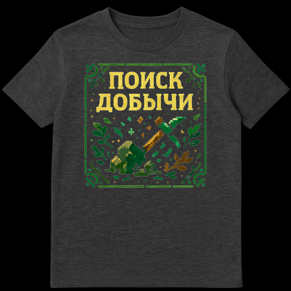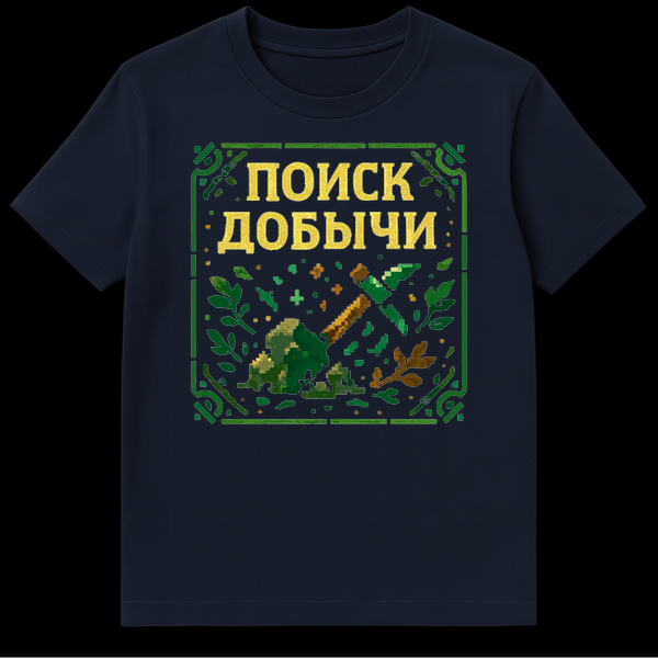 Dominating the top, the bold, golden, pixelated text “ŠŠŠŠ”Š ŠŠŠŠ«Š§Š” (POISK DOBYCHI) immediately catches the eye. This Russian phrase translates to “Search for Prey/Loot,” embodying the spirit of discovery and the thrill of the hunt. It’s a playful nod to the universal appeal of treasure hunting and resource gathering, often found in popular video games and folklore. The design cleverly blends a nostalgic gaming aesthetic with a universal theme, making it appealing to a broad audience who appreciate unique, culturally infused apparel. While there isn’t a specific ‘joke’ beyond the playful nature of the theme itself, the design’s appeal lies in its evocative imagery and the adventurous spirit it conveys, inviting wearers to embrace their inner explorer.