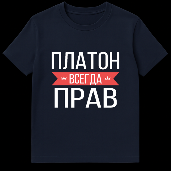 This t-shirt features bold white Cyrillic text on a stylish grey background, declaring “ŠŸŠ›ŠŠ¢ŠžŠ ŠŸŠ ŠŠ’ ВДЕГДА” (Platon is Always Right). A striking red banner with small crown icons highlights the word “ВДЕГДА” (always), adding a touch of regal assertion to this humorous statement. It’s a clean, typographic design with an undeniable witty appeal.