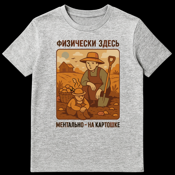 The clever slogan, split across the top and bottom of the illustration, delivers the punchline: “Š¤ŠŠŠŠ§ŠŠ”ŠŠ ŠŠŠŠ”Ь” (Physically here) at the top, followed by “ŠŠŠŠ¢ŠŠŠ¬ŠŠ – ŠŠ ŠŠŠ Š¢ŠŠØŠŠ” (Mentally – on potatoes) at the bottom. This phrase humorously captures the universal experience of physical presence combined with mental detachment, particularly relatable to anyone who has endured a demanding, repetitive task like potato farming. In many Slavic cultures, particularly Russian, “на каŃŃŠ¾Ńке” (on potatoes) or “копаŃŃ ŠŗŠ°ŃŃŠ¾ŃŠŗŃ” (digging potatoes) is a widely understood cultural reference to a period of mandatory, often grueling, communal or family labor during harvest season. It evokes shared memories of back-breaking work, camaraderie, and sometimes, a comical sense of resignation. This t-shirt is perfect for those who appreciate vintage aesthetics, dry humor, and a nod to a significant cultural touchstone.