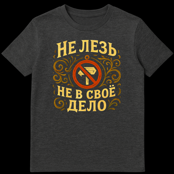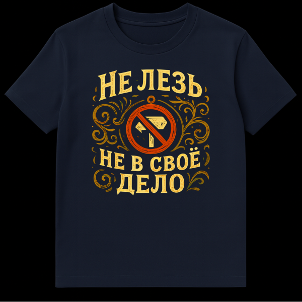The text, rendered in a distressed, golden-yellow font, features the Cyrillic phrase “ŠŠ• ЛЕЗЬ ŠŠ• Š’ Š”Š’ŠžŠ• Š”Š•Š›Šž.” This translates directly to “Don’t meddle in other people’s business” or “Mind your own affairs.” It’s a common Russian idiom, often used humorously or pointedly to tell someone to stay out of situations that don’t concern them. The joke lies in the combination of a universally understood privacy symbol with a culturally specific, direct, and slightly cheeky command to respect personal space.