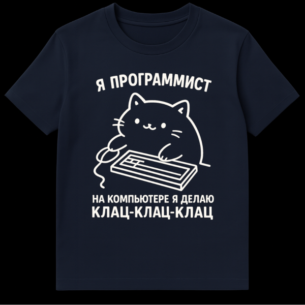 The humor is amplified by the white Russian Cyrillic text, which translates to: “ŠÆ ŠŠ ŠŠŠ ŠŠŠŠŠ”Š¢” (I am a programmer), followed by “ŠŠ ŠŠŠŠŠ¬Š®Š¢ŠŠ Š ŠÆ ŠŠŠŠŠ®” (On the computer I do), and finally, the onomatopoeic “ŠŠŠŠ¦-ŠŠŠŠ¦-ŠŠŠŠ¦” (Click-click-click). This playful slogan pokes fun at the often-complex world of programming by simplifying it to the most basic, repetitive action ā a cat’s “clicks” on a keyboard. It’s a humorous take on the daily grind of computer use, relatable to anyone who spends hours in front of a screen, and especially amusing for those who understand a cat’s seemingly simple yet profound world view. This design is a fantastic conversation starter and a must-have for those who enjoy a blend of cultural reference and tech humor.