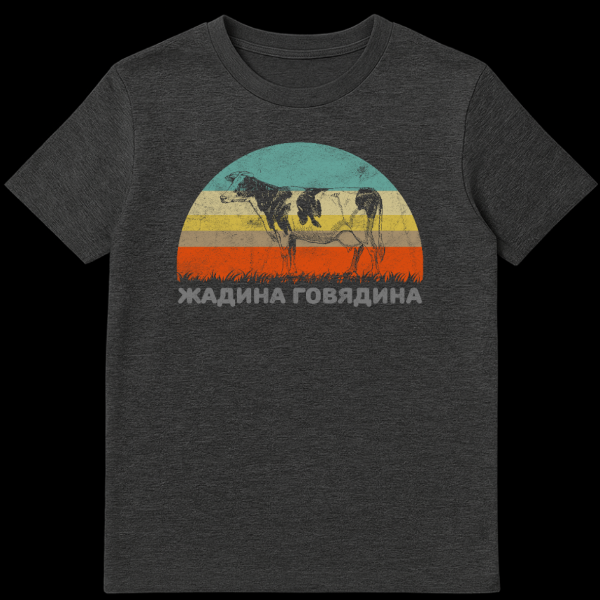 Tags: Cow silhouette, Cultural Humor, Graphic Tee, Greedy Beef, Retro Sunset, Russian Language, Russian T-Shirt, Slavic Gift, Unique Apparel, Zhadina Govyadina
