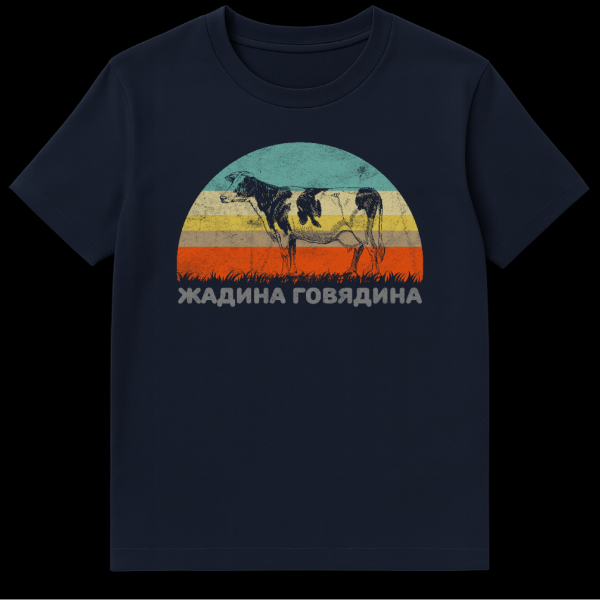 Step out in style with this captivating t-shirt, blending nostalgic aesthetics with a touch of Russian humor. The central motif showcases a bold cow silhouette, standing proudly against a stunning retro-style striped sunset, rendered in a warm palette of teal, yellow, brown, and orange, with lush green grass at the bottom. This eye-catching visual is complemented by the Russian phrase “ЖАДИНА ГОВЯДИНА,” which translates to “Greedy Beef.” This is not just a literal translation, but a popular, playful, and slightly teasing chant often used by Russian children towards someone who is being selfish or greedy. It evokes a sense of lighthearted nostalgia and cultural connection, making this t-shirt a conversation starter. Perfect for those who appreciate unique graphic tees, retro art, or have a fondness for Russian culture and its quirky expressions.