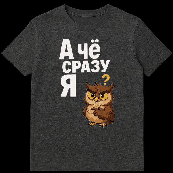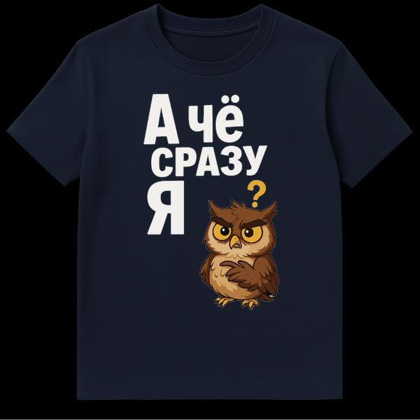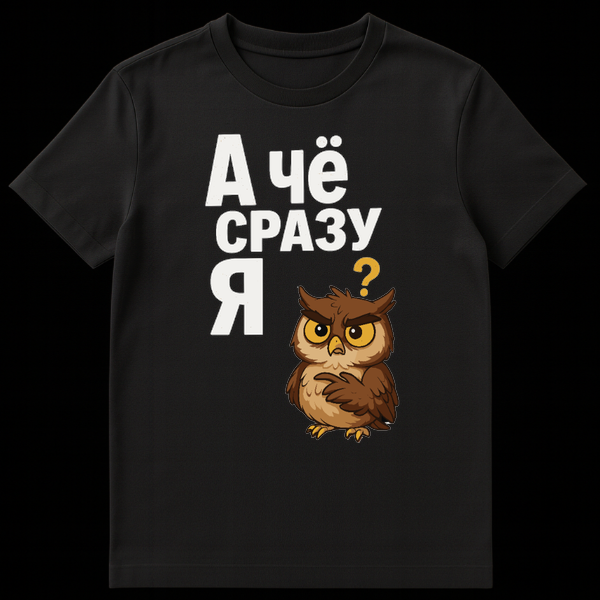 Dive into the humorous world of Russian slang with this expressive t-shirt! The design showcases a charmingly grumpy cartoon owl, its face a picture of skeptical annoyance, one wing dramatically raised in a classic “who, me?” gesture. This adorable yet exasperated character perfectly embodies the universal feeling of being unfairly singled out.