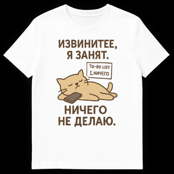 Unwind in style with our humorous ‘Busy Doing Nothing’ Russian T-Shirt, a perfect blend of cute charm and relatable laziness. This design showcases an adorable, light-brown cartoon cat, depicted in a state of ultimate relaxation, lying down with a phone resting comfortably on its belly. Above this master of idleness, a playful ‘To-Do List’ box boldly declares ‘1. Nothing.’ ā a sentiment many can relate to after a long week.