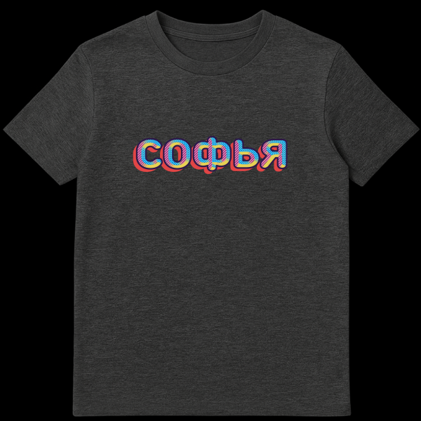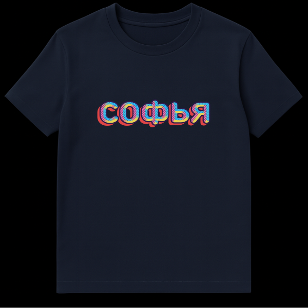 Celebrate individuality with our unique Russian T-Shirt, showcasing the beloved name “SOFYA” (Sofia) in an electrifying retro-pop art aesthetic. Each letter is a canvas of creativity, boldly outlined in dark blue and filled with an alternating medley of cool blue dots, energetic pink diagonal stripes, and sunny yellow solid color. This clever layering creates a playful depth and visual intrigue, further enhanced by a vibrant red drop shadow that gives the entire design a captivating 3D effect. Sofia, a name of Greek origin meaning ‘wisdom,’ is widely cherished in Russian culture, making this T-Shirt a wonderful way to honor personal heritage or simply appreciate a beautiful name. It’s a statement piece that blends cultural charm with a fun, eye-catching style, perfect for those who love unique graphic apparel.