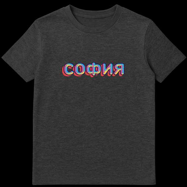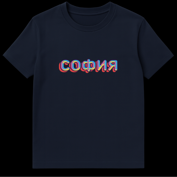 Step out in a splash of color and retro charm with our unique Russian T-Shirt, a wearable piece of pop art! This eye-catching design proudly displays the Cyrillic word ‘СОФИЯ’ (SOFIYA), which translates to ‘Sofia’. While Sofia is a beautiful city, this design celebrates the name in a fun, artistic way, making it a perfect pick for anyone who loves the name or simply appreciates bold, vibrant aesthetics. The lettering truly pops with a dark blue outline, filled with alternating patterns of diagonal stripes and polka dots in bright pink, sunny yellow, and sky blue. A prominent red drop shadow adds depth and a playful three-dimensional effect, evoking a classic retro-pop art vibe. This tee is more than just clothing; it’s a statement, blending cultural flair with a timeless, energetic style that’s sure to turn heads and spark conversations.