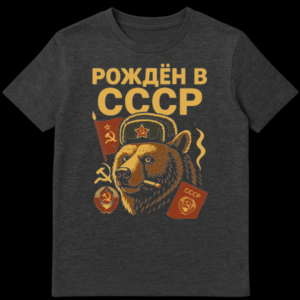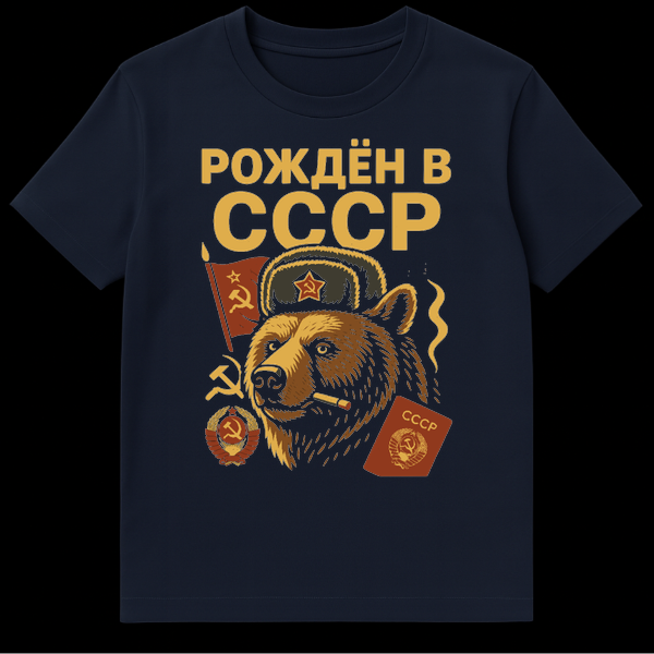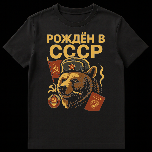 The prominent text “Š ŠŠŠŠŠ Š Š”Š”Š”Š ” (Born in the USSR) in large gold letters serves as the main slogan, directly translating to “Born in the USSR.” This phrase is a powerful statement for individuals who lived during the Soviet Union’s existence, or for those who appreciate the cultural and historical significance of that period. The ‘joke’ or appeal lies in the playful personification of the bear, combining a classic Russian animal symbol with Soviet iconography and a touch of rebellious attitude, creating a piece that is both thought-provoking and stylishly retro.