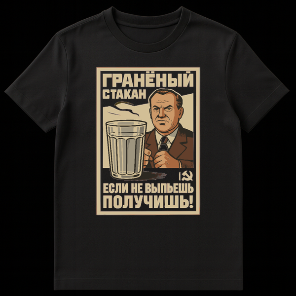 Step back in time with this compelling t-shirt, showcasing a Soviet-style propaganda poster design that’s both striking and humorous. The visual elements are classic socialist realism: a stern-faced man in a suit, embodying the authoritarian figure, gazes out with an unyielding expression. Central to the design is a ‘Š³ŃŠ°Š½ŃŠ½ŃŠ¹ ŃŃŠ°ŠŗŠ°Š½’ (graneny stakan), a traditional Russian faceted glass, brimming with liquid, symbolizing the ubiquitous presence of drinking in Soviet culture. A subtle hammer and sickle symbol reinforces the era.