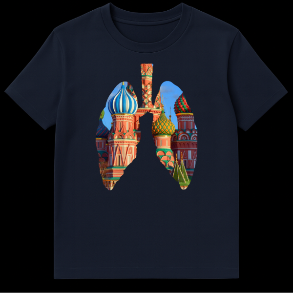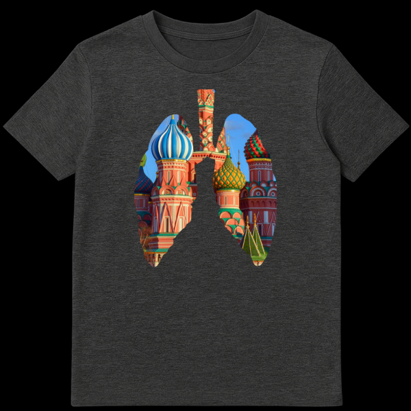 Immerse yourself in a captivating blend of human anatomy and iconic architecture with this unique Russian T-Shirt. The design showcases a detailed outline of human lungs, not with organic tissue, but with a stunning photographic image of St. Basil’s Cathedral in Moscow. Its colorful, onion-domed towers fill the lung cavity, creating a powerful visual metaphor. This photo-collage style masterfully contrasts the organic human form with the rigid beauty of an architectural landmark, making a bold statement. The theme suggests a profound connection between Russia, its rich culture, or even its geopolitical presence, and the very concept of ‘breathing’ or vital essence. It implies a deep, intrinsic impact or an omnipresent influence, making this more than just a garment, but a conversation starter. There is no visible text, slogan, or overt joke, allowing the visual impact and symbolic depth to speak for itself. Perfect for those who appreciate thought-provoking art, cultural commentary, or simply a unique aesthetic.