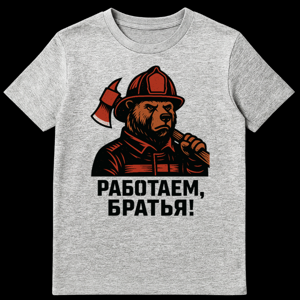 Unleash your inner strength with our ‘Let’s Work, Brothers!’ T-shirt, featuring a powerful and symbolic design. The central figure is a stern-faced bear, a creature often associated with strength and resilience in Russian culture, proudly donned in a firefighter’s helmet and uniform. It holds an axe resolutely over its shoulder, a classic tool of the trade, signaling readiness and determination.
