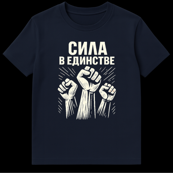 Embrace a powerful message of solidarity and empowerment with this unique t-shirt. The design showcases three stylized, cream-colored raised fists, a universal symbol of unity and resistance, set against a stark black background. Dynamic radiating lines emanate from the fists, visually emphasizing their collective power and impact, reminiscent of classic protest art or vintage propaganda posters. Above this iconic imagery, the white Cyrillic text “Š”ŠŠŠ Š ŠŠŠŠŠ”Š¢ŠŠ” (SILA V EDINSTVE) boldly proclaims “Strength in Unity.” This slogan, deeply resonant and universally understood, reinforces the theme of collective power and mutual support. The style evokes a sense of historical significance and enduring struggle, making it more than just apparelāit’s a statement. There is no explicit joke described in the design; its appeal lies in its strong, direct message and evocative visual style, drawing on cultural references of activism and collective strength.