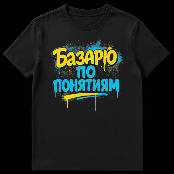 Embrace the raw energy of urban street art with this distinctive t-shirt. The design showcases the Ukrainian phrase “ŠŠ°Š·Š°ŃŃ ŠæŠ¾ понŃŃŠøŃм” (pronounced ‘Bazaryu Po Ponyatiyam’), which translates roughly to “I speak by the rules/understandings” or “I operate by the code.” This phrase carries a nuanced meaning, often implying a deep understanding of unspoken social rules or a street-smart approach to life, making it a statement piece for those who appreciate cultural depth.